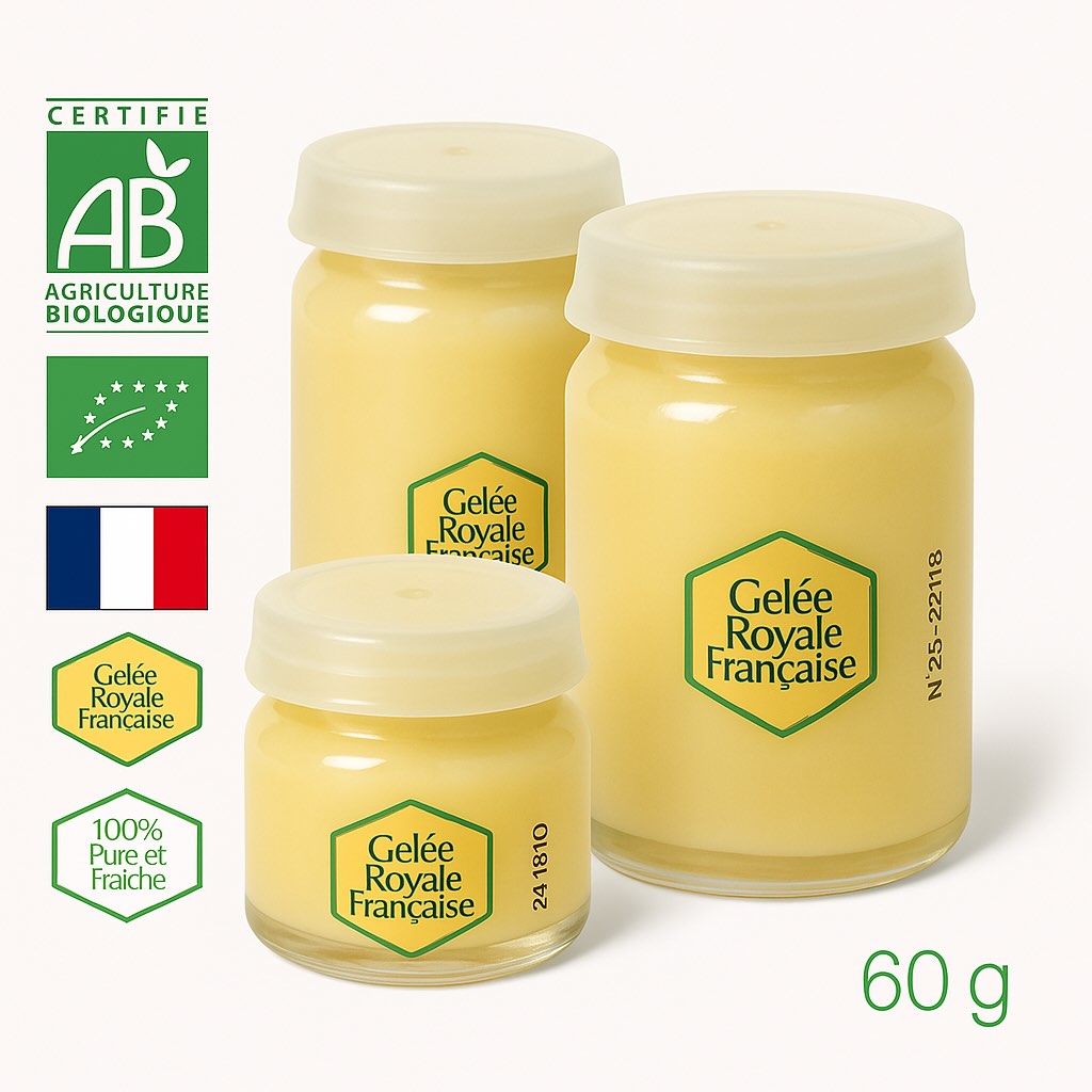 Soutenez les apiculteurs français, achetez de la Gelée Royale Bio (biologique) certifiée GRF, certifiée non congelée, sans ajout. Le label GRF garantie la provenance de France et le respect d’un cahier des charges strict de production.